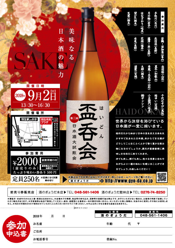 酒のぎょうだ様主催の試飲会です。当日は約100銘柄の飲み比べ試飲が出来ますので、是非ご参加ください。