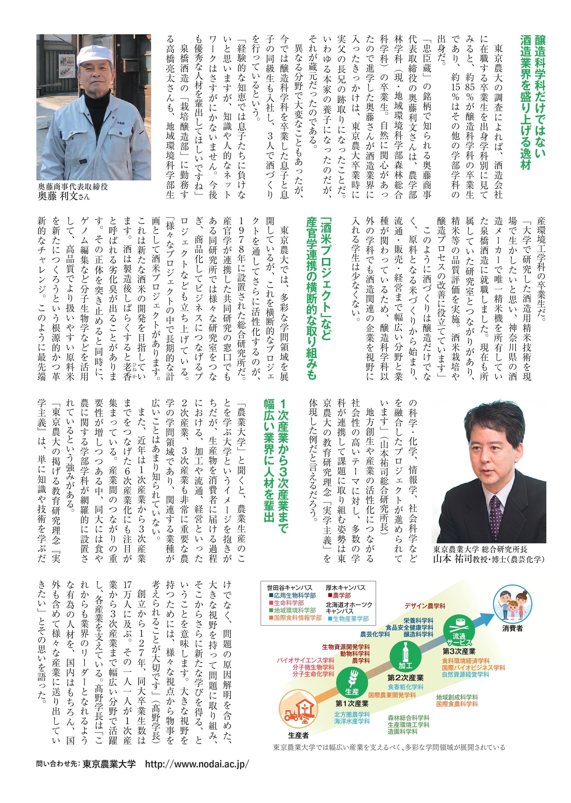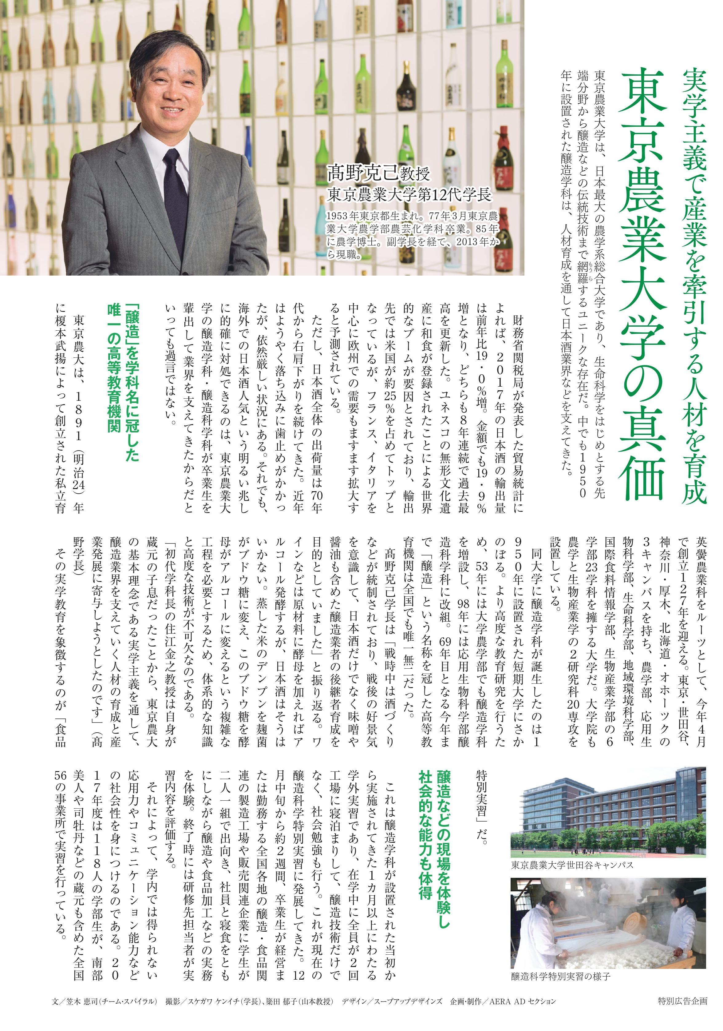 朝日新聞出版が発行する雑誌「AERA」に、東京農業大学の特集記事が掲載され、出羽桜も登場しています!社長の仲野益美が醸造学科の卒業生として輸出に関して語っています。ぜひご覧になってみてください!